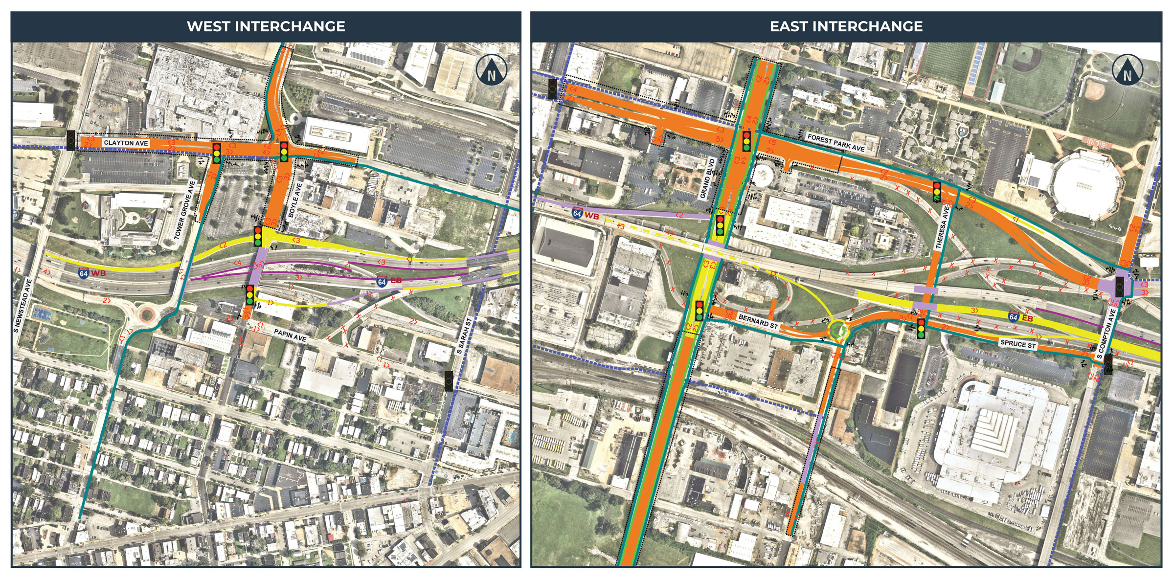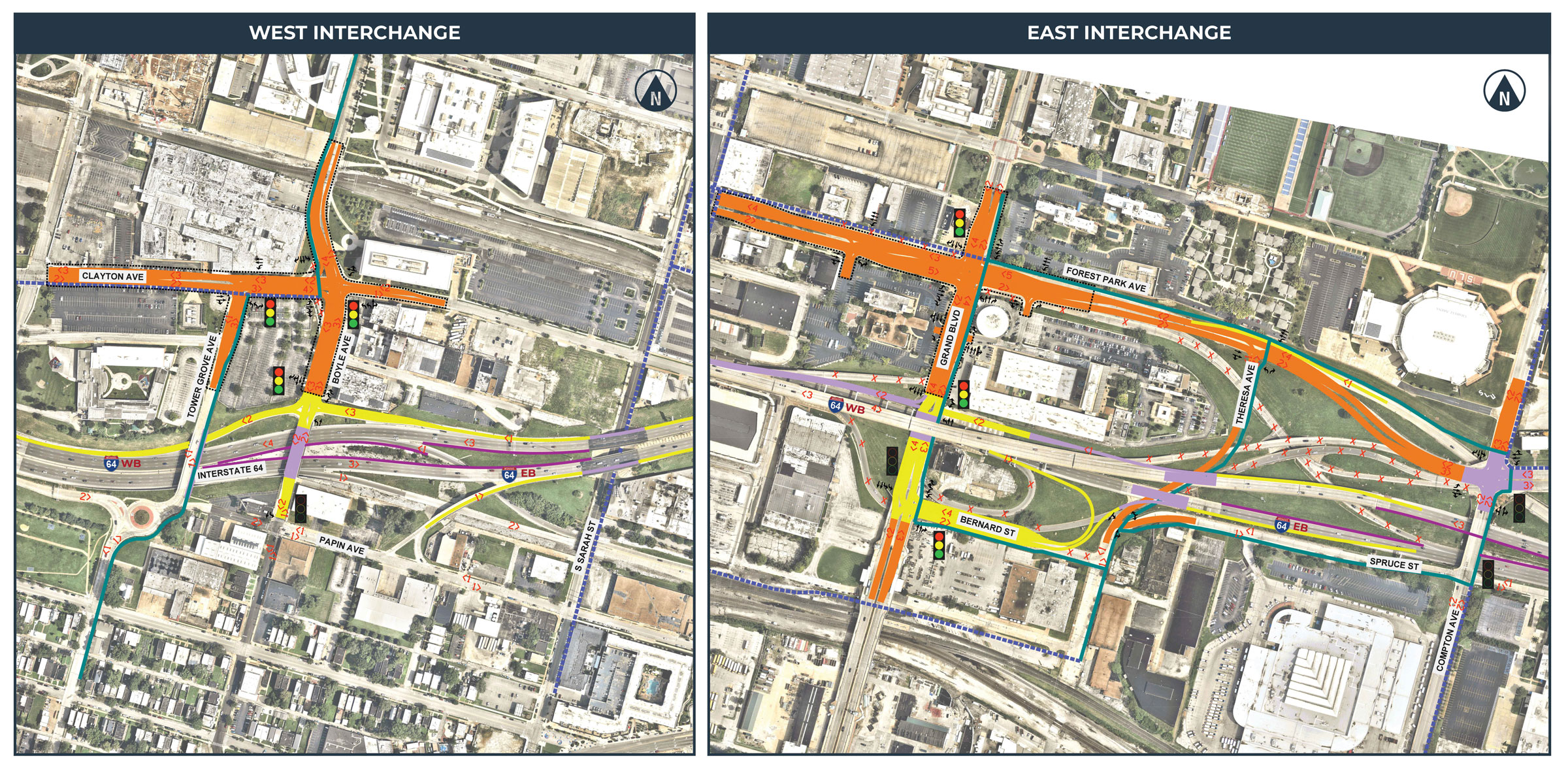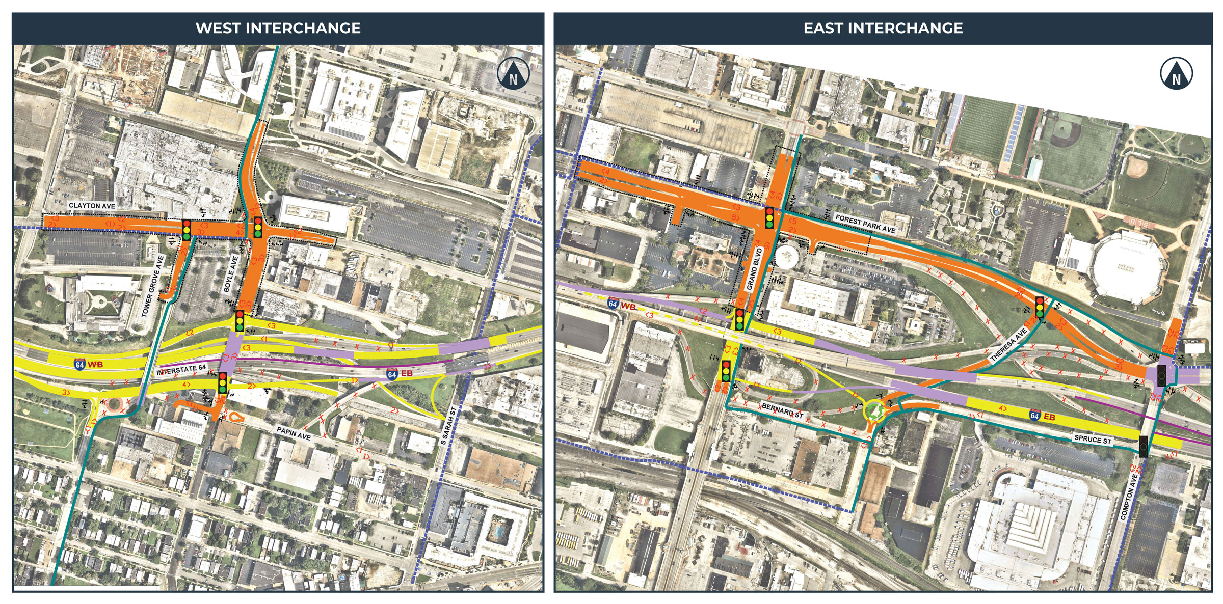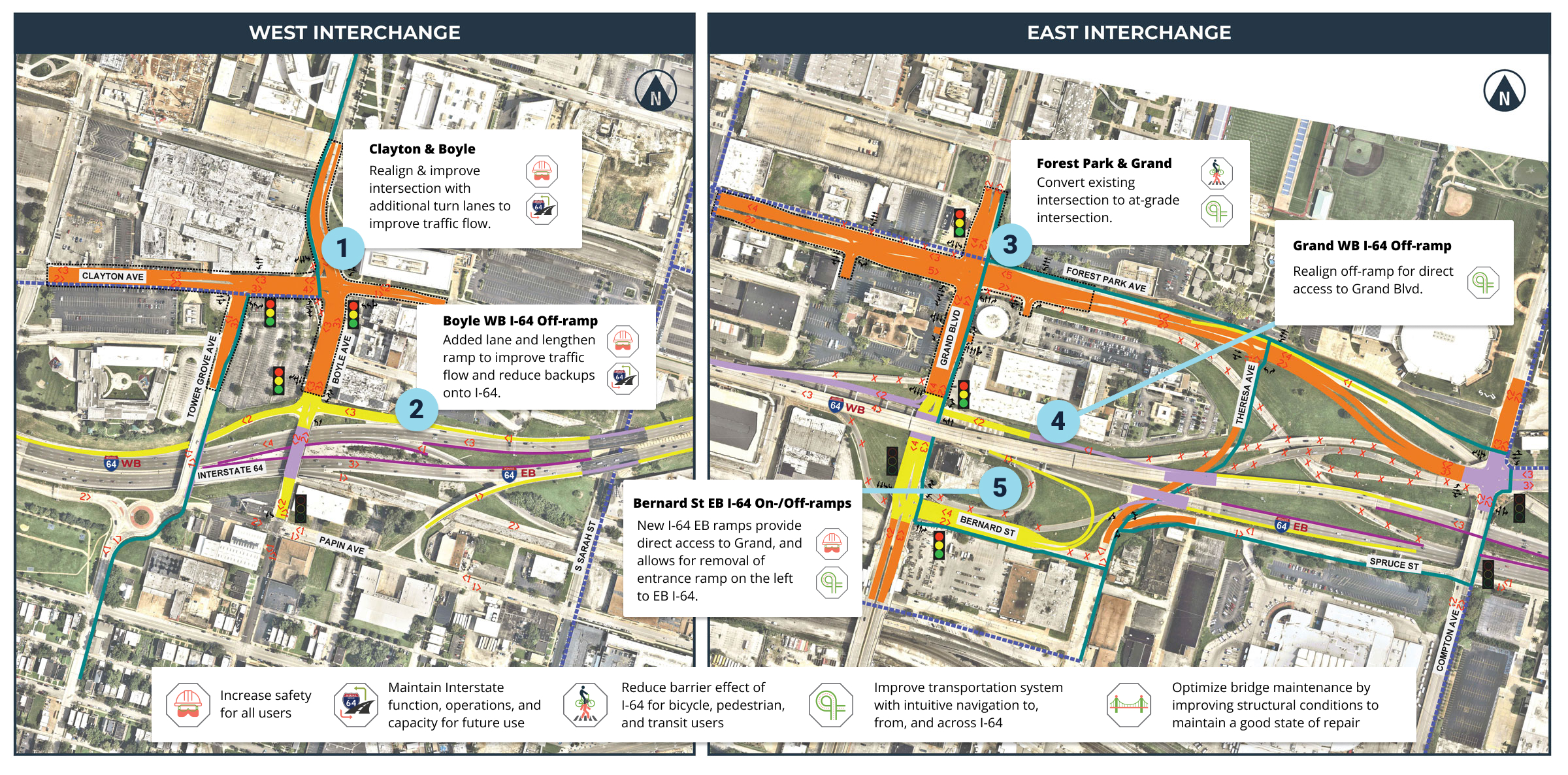 - Consolidates the Vandeventer and Tower Grove off-ramps