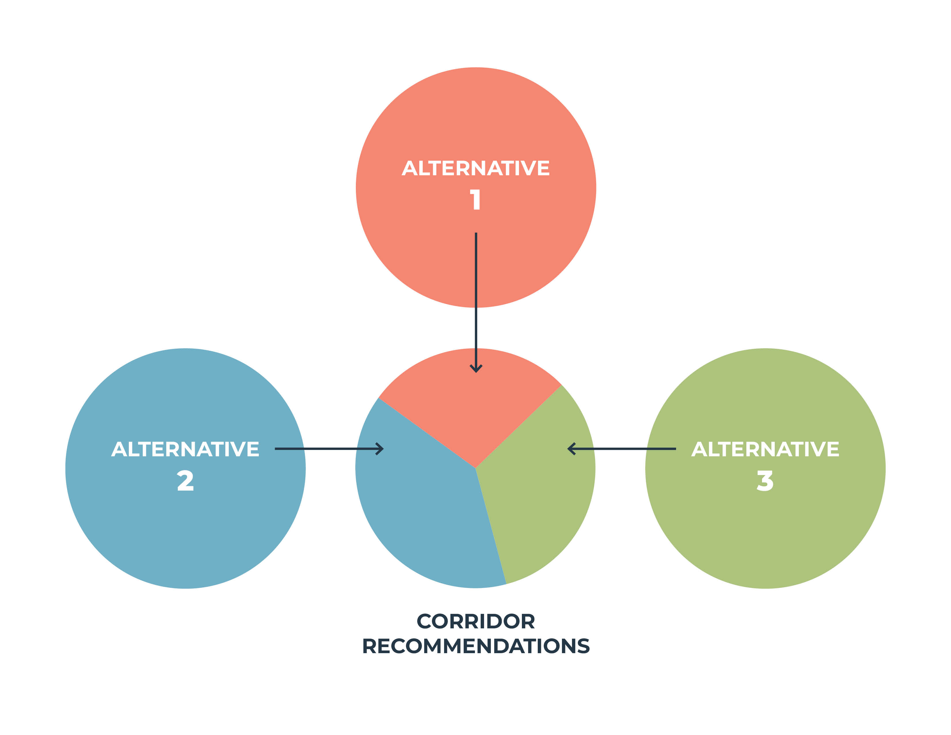 The remaining ideas from the brainstorming phase were assembled into three full corridor alternatives, designed to represent a variety of options. A full safety and traffic analysis was run on each alternative to determine how the ideas would work together as a system and to find the strengths and weaknesses of the different elements. A community assessment was also done to address possible benefits and opportunities of the new road layout.